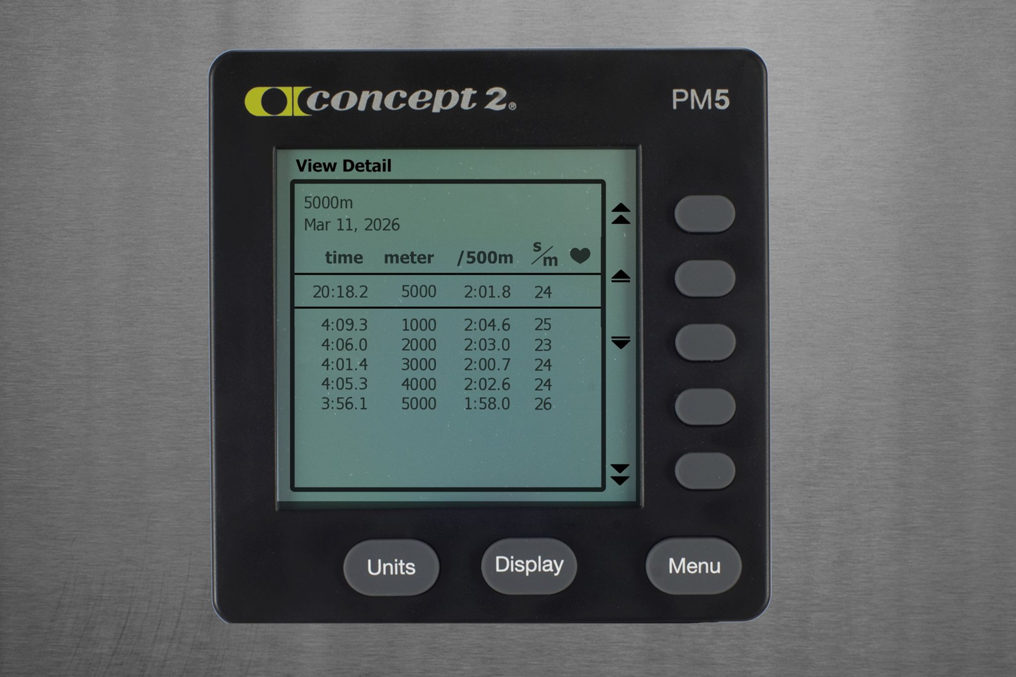 Knocked this out right after a CrossFit workout. Stats Distance 5,000 m Pace 2:01.8 / 500m Time 20:18.2